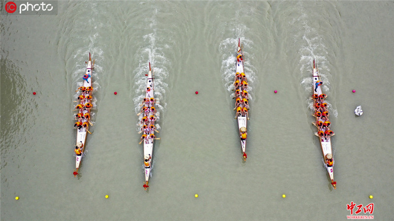 2020年6月23日,江苏淮安,参加龙舟比赛的选手比赛中。