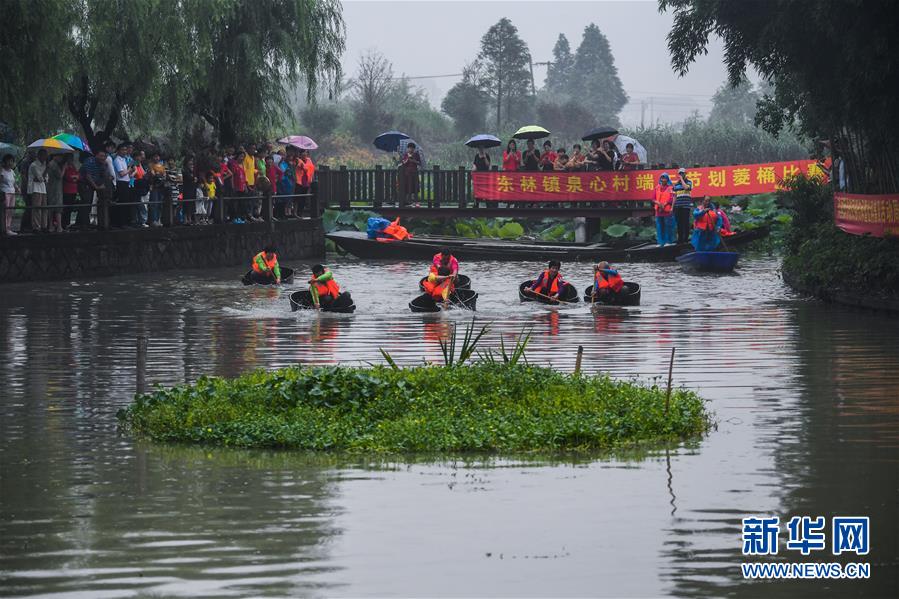 6月23日,东林镇村民在泉心村荷花池参加端午划菱桶趣味活动。 当日,浙江省湖州市东林镇在泉心村荷花池举办“庆端午 划菱桶”趣味活动。村民们划着菱桶在水面上你追我赶,同时采收荷花和莲蓬,呈现出水乡特有的端午节日氛围。在河网密布的东林镇,菱桶是水乡家家户户都有的一种传统水上劳动工具,村民在捕鱼、采菱、采荷时都要用到。 新华社记者 徐昱 摄
