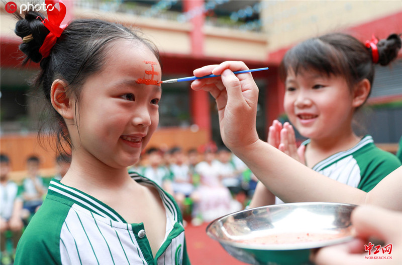 2020年6月23日,四川省广安华蓥市清溪路幼儿园的孩子, 在接受寓意能祛病驱邪的额头点雄黄酒。