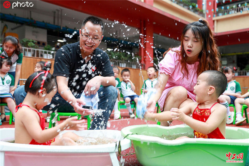 2020年6月23日,四川省广安华蓥市清溪路幼儿园的孩子, 在开心中用寓意能祛病驱邪的艾叶水洗澡。