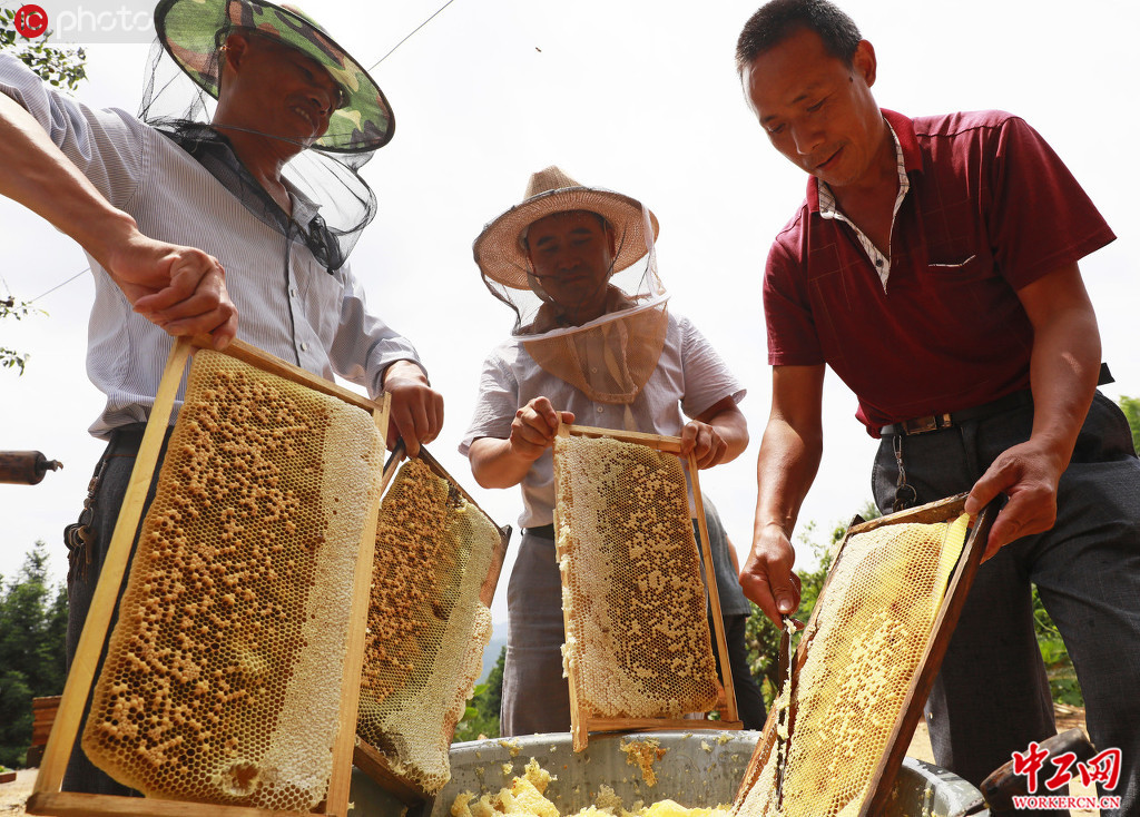 2020年6月22日,江西省吉安市泰和县老营盘镇山区,贫困户正在采收蜂蜜。