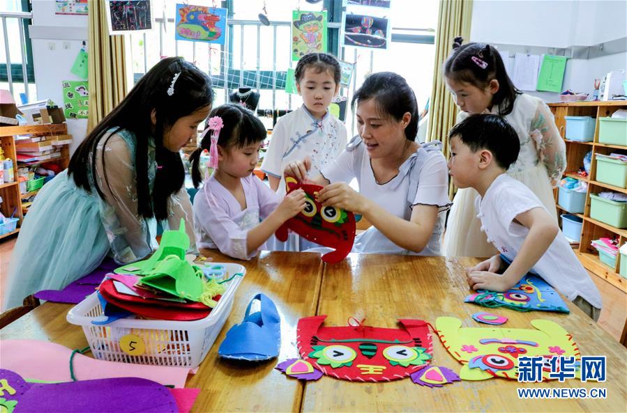 6月23日,长兴县开发区实验幼儿园的孩子们在教师指导下学做虎头鞋、虎头帽。 为了迎接即将到来的端午节,浙江省湖州市长兴县各个幼儿园开展“品民俗 迎端午”主题活动,让小朋友们体验传统民俗文化。 新华社记者 徐昱 摄
