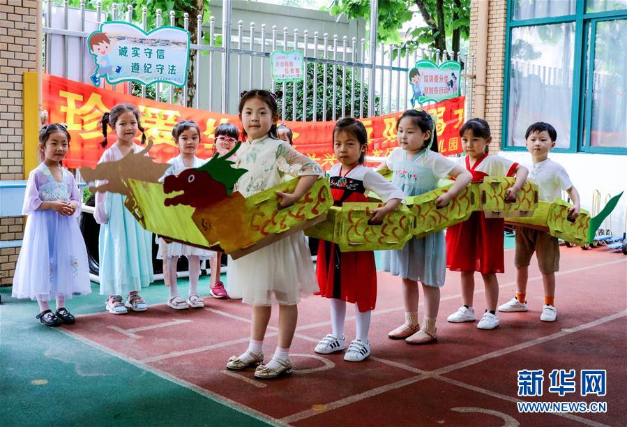 6月23日,长兴县开发区实验幼儿园的孩子们用废旧的纸箱做成“龙舟”进行表演。 为了迎接即将到来的端午节,浙江省湖州市长兴县各个幼儿园开展“品民俗 迎端午”主题活动,让小朋友们体验传统民俗文化。 新华社记者 徐昱 摄