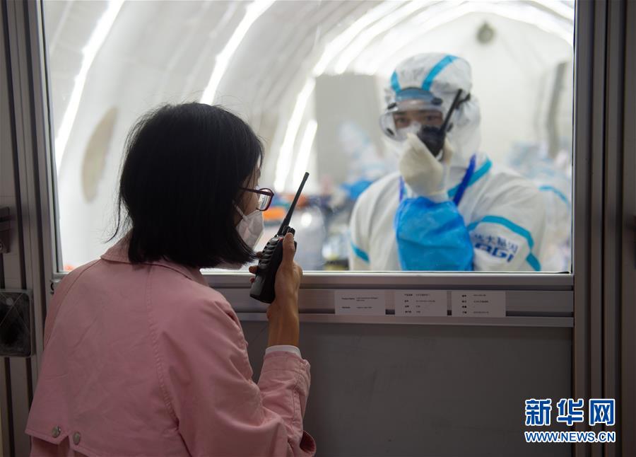 6月23日,工作人员在气膜舱内外通过对讲机交谈。新华社发(陈钟昊 摄)