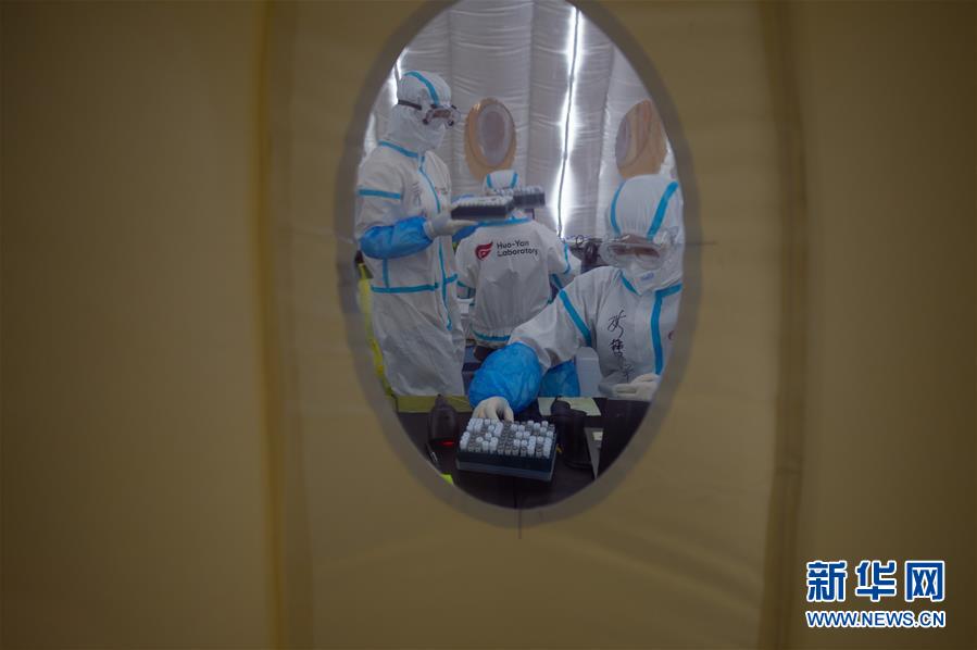 6月23日,工作人员在气膜舱内处理样本。 新华社发(陈钟昊 摄)