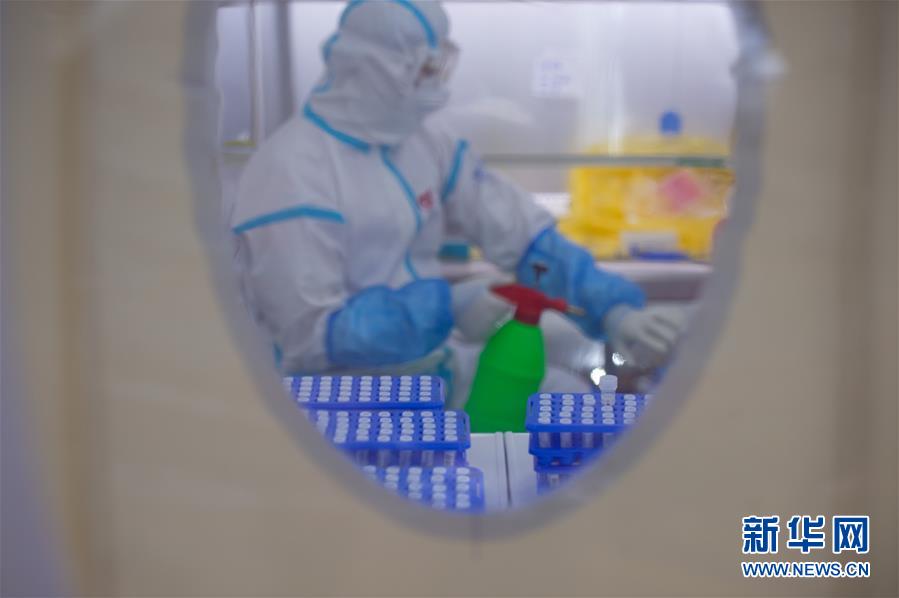 6月23日,工作人员在气膜舱内给自己消毒。新华社发(陈钟昊 摄)