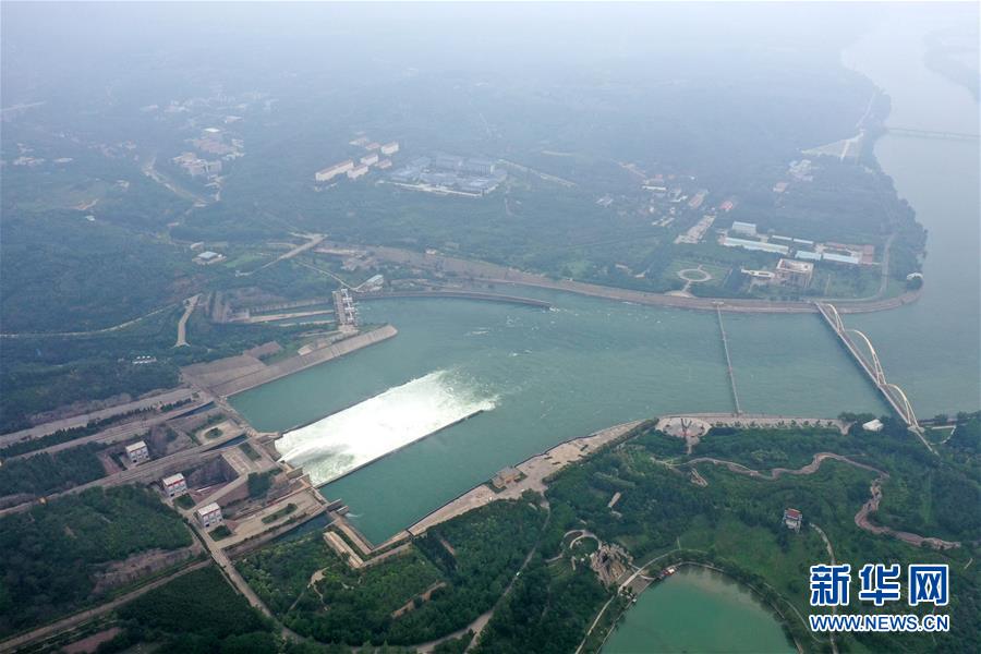 这是6月23日拍摄的黄河小浪底水利枢纽工程(无人机照片)。 近日,黄河小浪底水利枢纽工程开启洪水调度运用模式,从空中俯瞰,蔚为壮观。 新华社记者 冯大鹏 摄