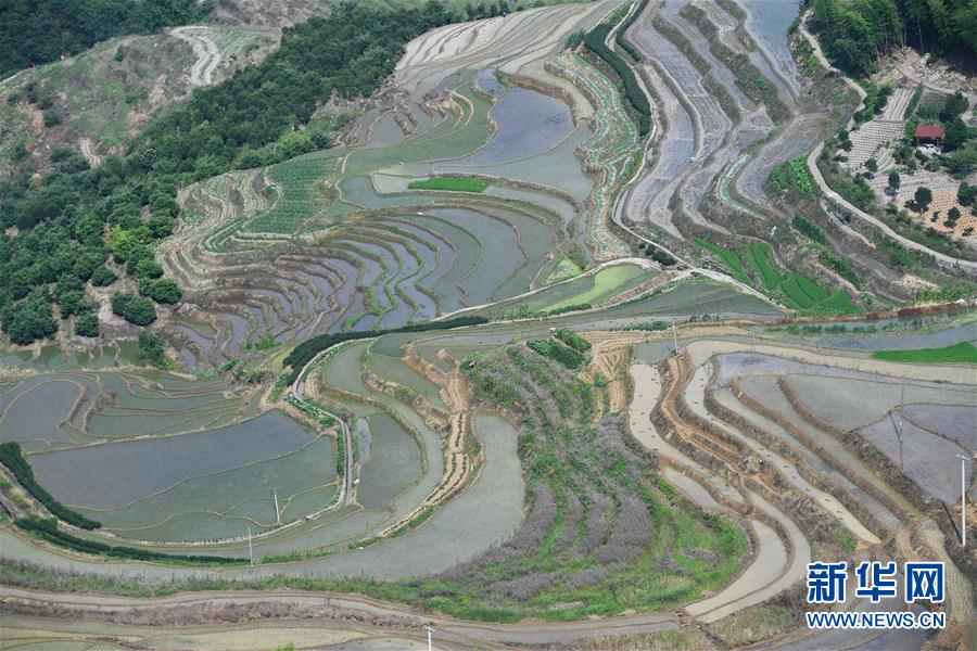 这是6月23日拍摄的念山梯田(无人机照片)。 念山梯田位于福建省政和县星溪乡念山村,历史悠久。近年来,当地政府引导农民以传统方式耕种梯田,促进农业生态资源的保护和利用,展现高山梯田自然生态景观和历史悠久的农耕文化。 新华社记者林善传摄