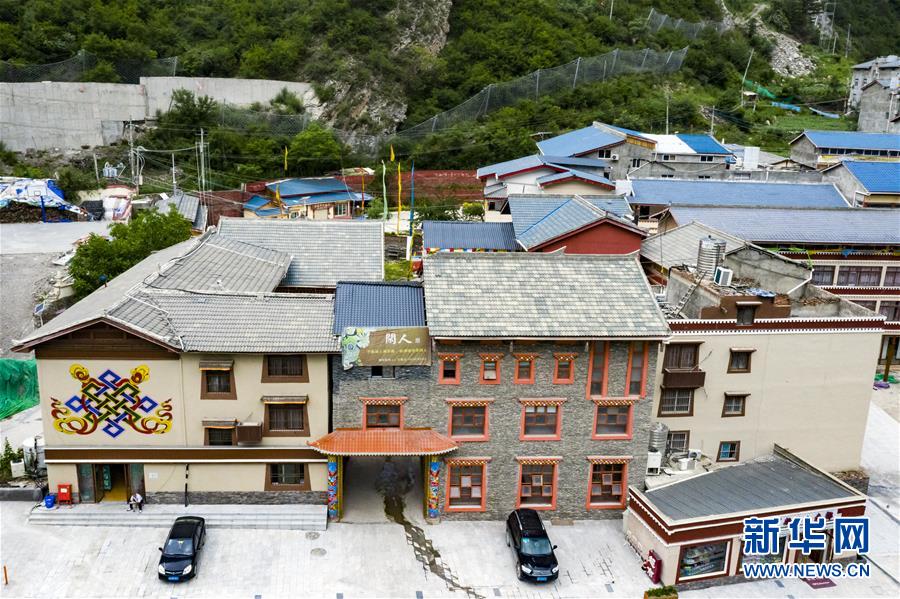 四川省阿坝藏族羌族自治州九寨沟县漳扎镇新建的用于旅游接待等功能的藏式风格民居(无人机照片,6月18日摄)。新华社记者 沈伯韩 摄