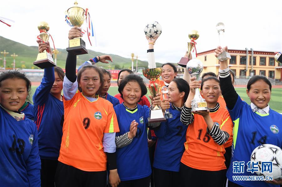 碌曲县藏族中学女足队员们展示她们获得过的奖杯(6月22日摄)。 新华社记者陈斌摄