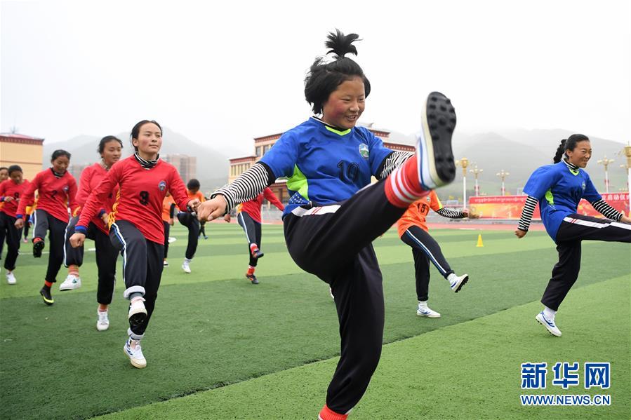碌曲县藏族中学女足队员万得草(前)和队友一起热身(6月22日摄)。 新华社记者陈斌摄