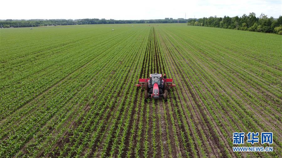 6月20日,农户在黑龙江垦区新华农场的玉米地块进行田间管理。新华社发(孙建波 摄)
