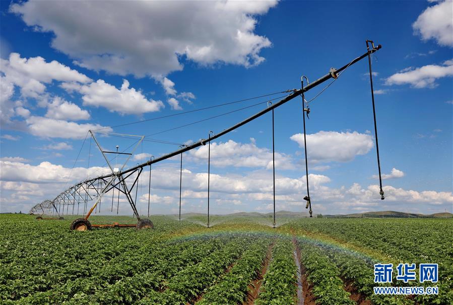 喷灌设备在河北省张家口市塞北管理区的田间作业(2019年7月27日摄,无人机照片)。新华社记者 杨世尧 摄