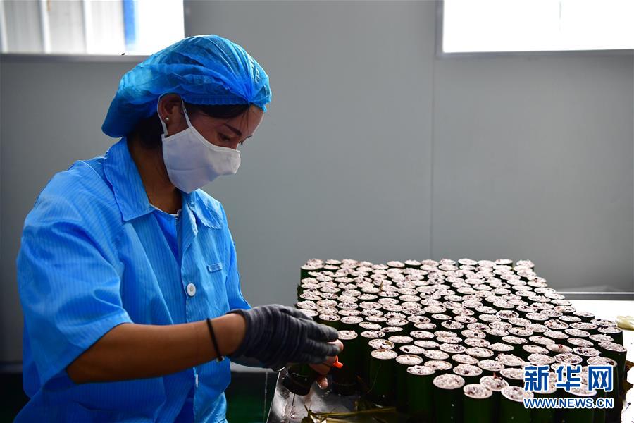 6月23日,在河南省洛阳市洛宁县景阳镇北村,工作人员在一家食品公司生产车间内制作竹筒粽子。 新华社记者 冯大鹏 摄