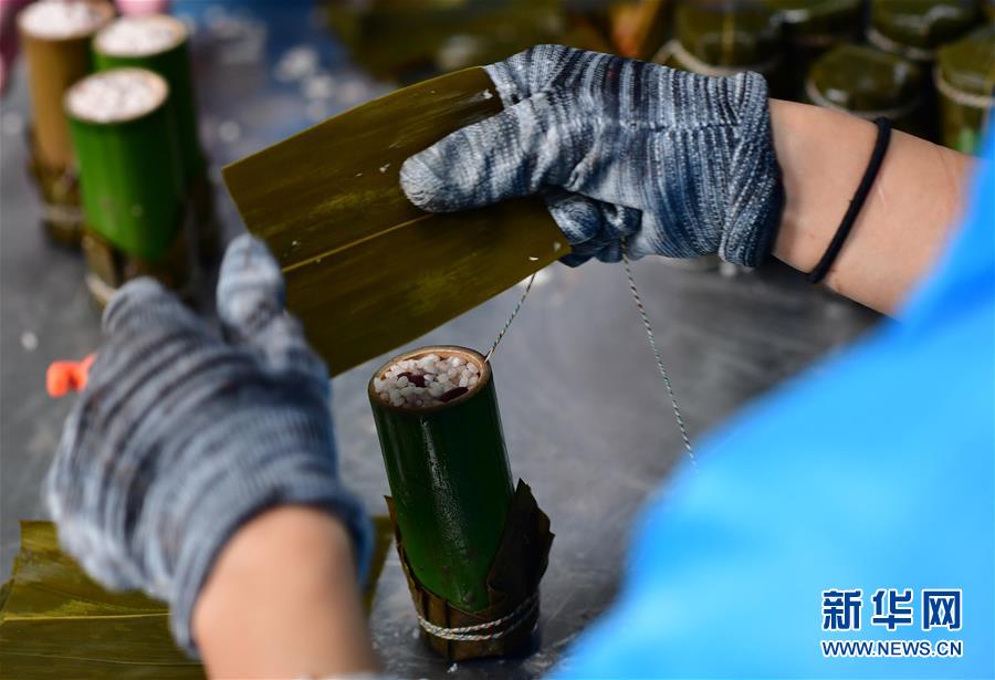 6月23日,在河南省洛阳市洛宁县景阳镇北村,工作人员在一家食品公司生产车间内制作竹筒粽子。 新华社记者 冯大鹏 摄