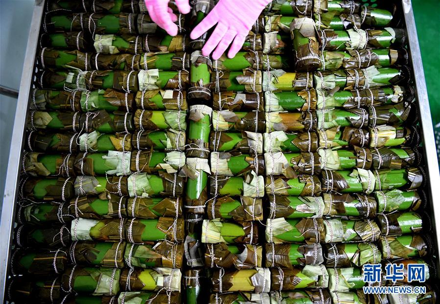 6月23日,在河南省洛阳市洛宁县景阳镇北村,工作人员在一家食品公司生产车间内整理竹筒粽子。 新华社记者 郝源 摄