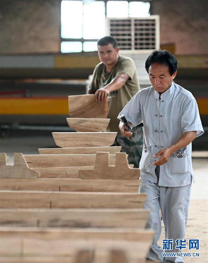 图为6月13日,汨罗市屈子祠镇九子龙屈原龙舟厂内,许桂生正在检查制作中的龙舟。 新华社记者李尕摄