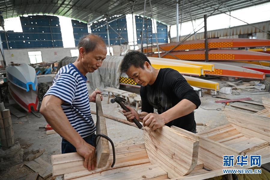 图为6月13日,汨罗市屈子祠镇九子龙屈原龙舟厂内,造船工人李亚芬(左)正在和同事一起制作龙舟。 新华社记者李尕摄