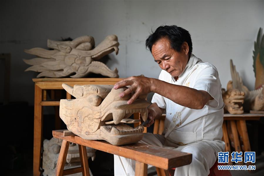 图为6月11日,汨罗市屈子祠镇九子龙屈原龙舟厂内,许桂生正在雕制龙头。 新华社记者李尕摄
