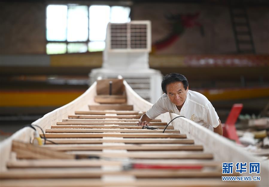 图为6月14日,汨罗市屈子祠镇九子龙屈原龙舟厂内,许桂生正在检查龙舟的船舷。 新华社记者李尕摄