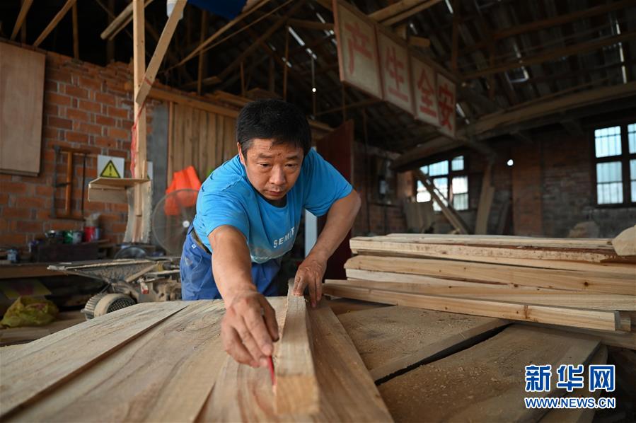 图为6月11日,汨罗市屈子祠镇九子龙屈原龙舟厂内,制船工人湛红正在准备木料。 新华社记者李尕摄