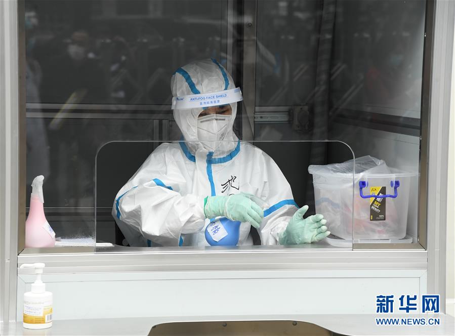 6月24日,在北京安贞医院核酸检测采样点,医护人员在防疫检测单元内进行手部消毒。 近日,由同方威视技术股份有限公司设计、制造的防疫检测单元、防疫检测移动舱在北京安贞医院投入使用。 据了解,防疫检测移动舱可以在舱体的左右两侧由两名医护人员同时进行新冠病毒检测咽拭子的采集工作,同时具有负压隔离功能。防疫检测移动舱的下面装有轮子,可以随时拖挂移动到有需求的地方进行检测。防疫检测单元和防疫检测移动舱均具有空调降温、紫外线消毒等功能。 新华社记者 任超 摄