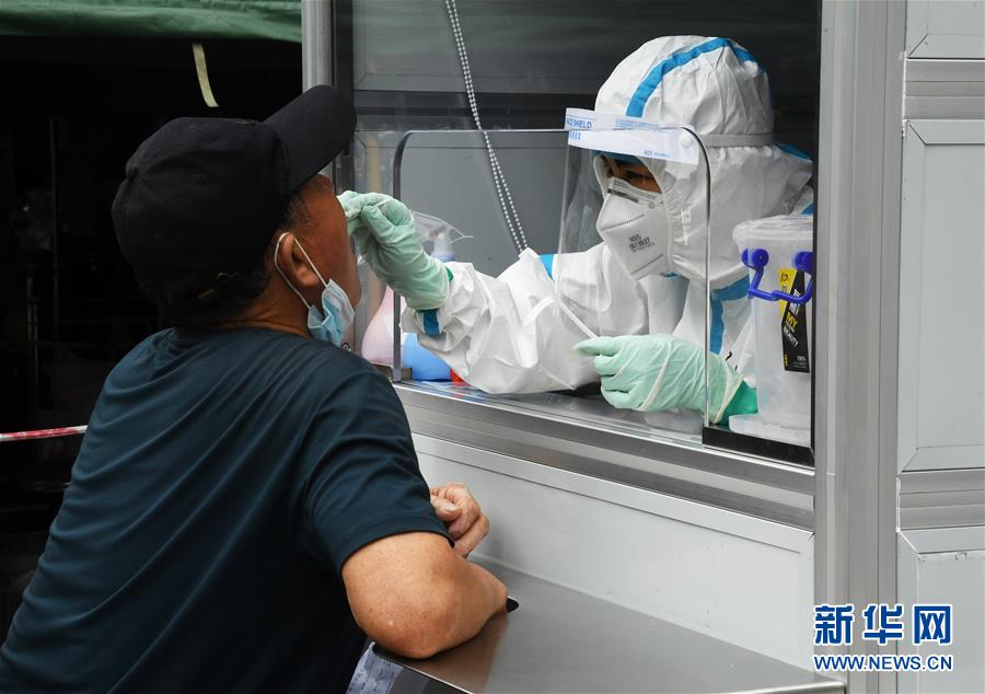 6月24日,在北京安贞医院核酸检测采样点,医护人员在防疫检测单元内为市民进行咽拭子采集。 近日,由同方威视技术股份有限公司设计、制造的防疫检测单元、防疫检测移动舱在北京安贞医院投入使用。 据了解,防疫检测移动舱可以在舱体的左右两侧由两名医护人员同时进行新冠病毒检测咽拭子的采集工作,同时具有负压隔离功能。防疫检测移动舱的下面装有轮子,可以随时拖挂移动到有需求的地方进行检测。防疫检测单元和防疫检测移动舱均具有空调降温、紫外线消毒等功能。 新华社记者 任超 摄