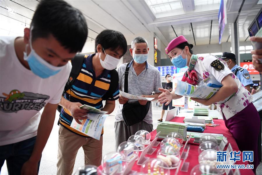 6月24日,在重庆北站开展的“健康人生,绿色无毒”全民禁毒宣传活动上,铁路工作人员在向候车旅客发放禁毒宣传资料。 当日,在“6·26”国际禁毒日来临前,各地开展多种类型的禁毒宣传活动,呼吁广大群众增强自我保护和禁毒拒毒意识,远离毒品危害。 新华社记者 唐奕 摄