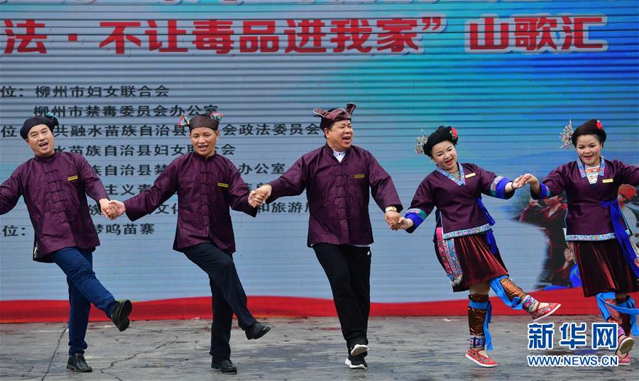 6月24日,在广西柳州市融水苗族自治县举办的“民族山歌宣传法 不让毒品进我家”国际禁毒日宣传活动上,侗族山歌队通过歌舞形式进行禁毒知识宣传。 当日,在“6·26”国际禁毒日来临前,各地开展多种类型的禁毒宣传活动,呼吁广大群众增强自我保护和禁毒拒毒意识,远离毒品危害。 新华社记者 黄孝邦 摄