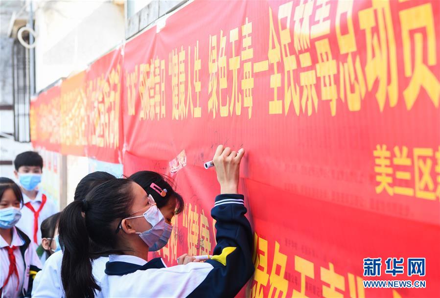 6月24日,海南省公安厅海岸警察总队(筹备组)海口支队联合海口市美兰区新埠街道办事处,在海口市海联中学组织开展禁毒主题宣传活动。这是中学生在“健康人生,绿色无毒”签名活动中签名。 当日,在“6·26”国际禁毒日来临前,各地开展多种类型的禁毒宣传活动,呼吁广大群众增强自我保护和禁毒拒毒意识,远离毒品危害。 新华社记者 杨冠宇 摄