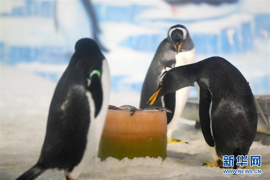 6月24日,哈尔滨极地馆的企鹅在享用工作人员送来的美食。 当日,哈尔滨极地馆的工作人员特地准备了“鱼粽”“肉粽”,让生活在这里的极地动物也品尝一下端午美食。 新华社记者 王建威 摄