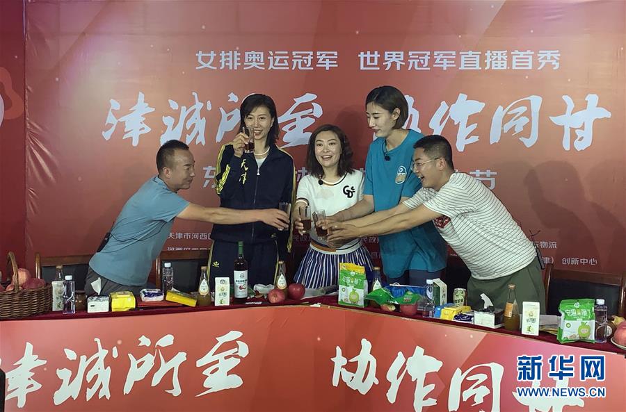 6月21日,杜小斌(左一)、关训兵(右一)与女排名将李珊(左二)、王媛媛(右二)一起在甘肃省平凉市庄浪县“直播带货”。 新华社发