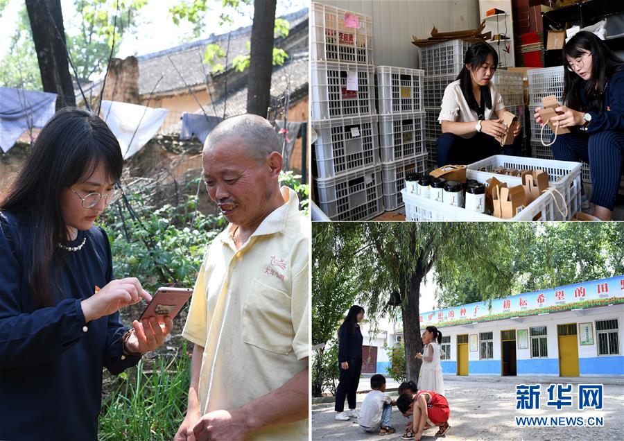 拼版照片:左图为关庙村扶贫干部石岚(左)在指导贫困户王黑使用智能手机;右上图为石岚(右)与村民一起打包金珠沙梨膏;右下图为石岚(左一)在村小学跟孩子们交流(图片均为6月24日摄)。 新华社记者 郝源 摄