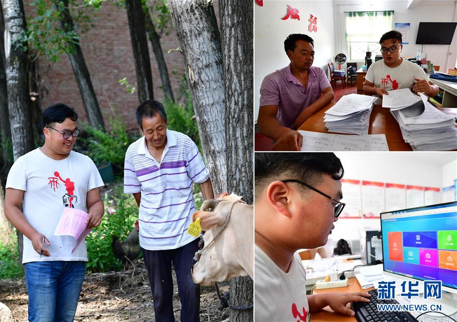 拼版照片:左图为关庙村扶贫干部汤威(左)走访贫困户时了解养牛脱贫情况;右上图为汤威(右)在整理关庙村外出务工人员就业补助申请表;右下图为汤威通过网络系统填报关庙村脱贫攻坚情况(图片均为6月24日摄)。 新华社记者 冯大鹏 摄