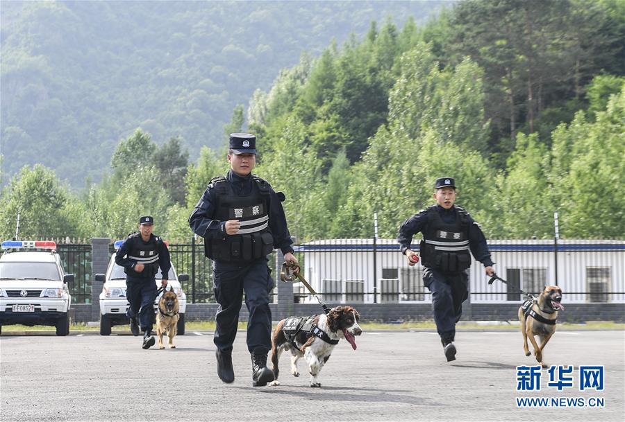 缉毒犬“黑飒”和训导员江枫(前)在进行体能训练(6月22日摄)。 新华社记者 许畅 摄