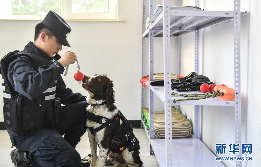 进行可疑物品搜寻训练前,训导员江枫让缉毒犬“黑飒”嗅闻训练使用的目标物品(6月22日摄)。 新华社记者 许畅 摄