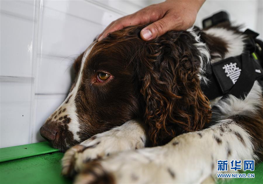 结束训练和执勤任务后,缉毒犬“黑飒”趴在犬舍内休息(6月22日摄)。 新华社记者 许畅 摄
