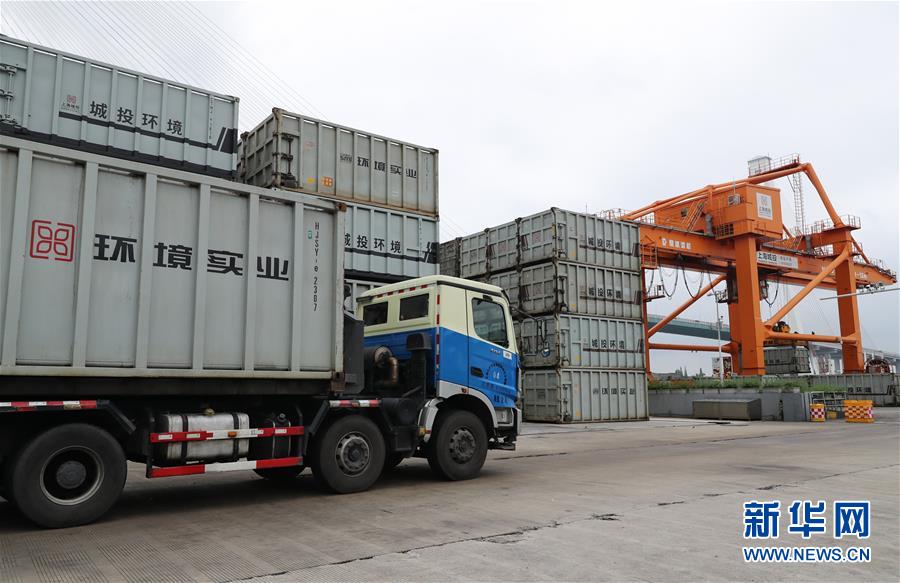 一辆装载有生活垃圾集装箱的卡车驶向上海城投环境集团徐浦基地内的码头,准备装船(6月22日摄)。新华社记者 方喆 摄