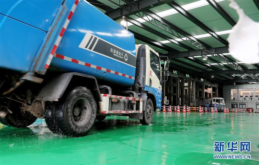 一辆干垃圾清运卡车驶入上海城投环境集团徐浦基地的卸料大厅(6月22日摄)。新华社记者 方喆 摄