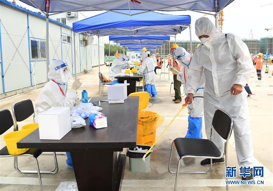 6月26日,在海淀区香山安置房C地块项目建筑工地的一处临时核酸检测采样点,工作人员(前右)进行消毒作业。 当日,医护人员为北京海淀区香山安置房C地块、五棵松冰上运动中心等8个项目的1750余名建筑工地人员进行核酸检测采样。 新华社记者 任超 摄