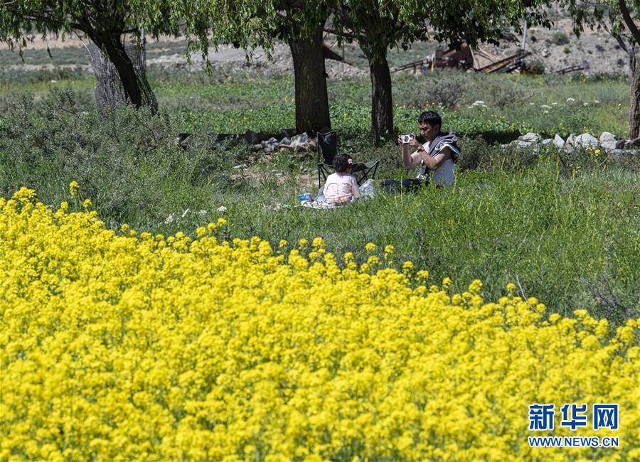 在位于拉萨市柳梧乡达东村的油菜花田里,一名游客在给孩子拍照(6月25日摄)。 时下,在位于拉萨河畔的拉萨市柳梧乡达东村,成片的油菜花竞相绽放,金黄色的花海在微风吹拂下涌起波浪,分外迷人。 新华社记者 孙非 摄