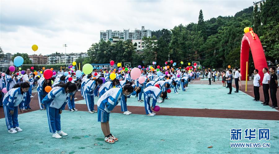 6月27日,乌当中学高三学生向老师鞠躬表达感谢。 当日,贵阳市乌当中学高三学生毕业典礼暨成人仪式在该校校园广场举行。 新华社记者 陶亮 摄