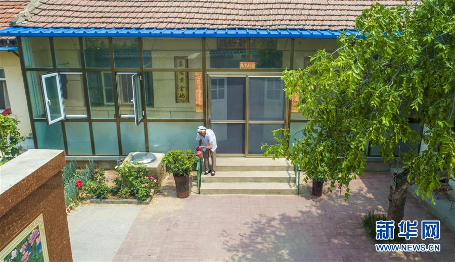 6月27日,河北省故城县郑口镇后响沟村村民在院子里给绿植浇水(无人机照片)。新华社记者 李晓果 摄