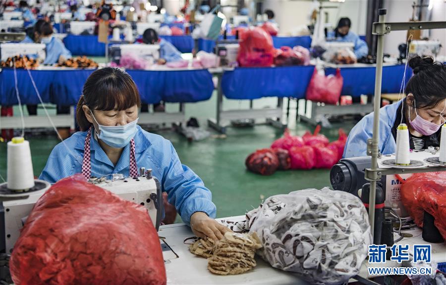 在岚皋县民主镇下河坝易地扶贫搬迁安置小区的毛绒玩具厂内,工人们在工作(5月12日摄)。这个社区工厂为搬迁的300多人提供了就业岗位。新华社记者陶明摄