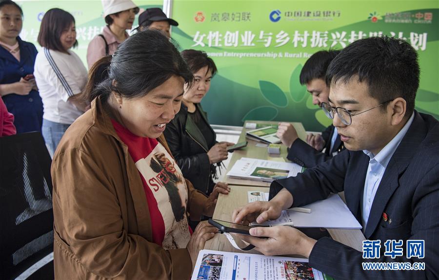 中国建设银行岚皋支行工作人员(右)在民主镇下河坝易地扶贫搬迁安置小区为居民办理贷款服务(5月12日摄)。新华社记者陶明摄