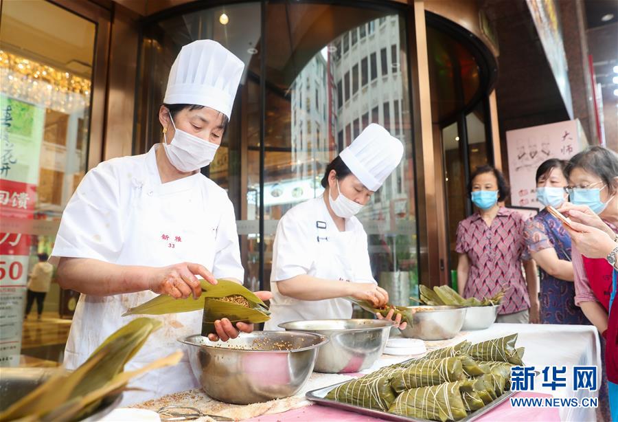 6月23日,在上海南京路步行街,新雅粤菜馆的工作人员在商铺前包粽子。新华社记者 丁汀 摄