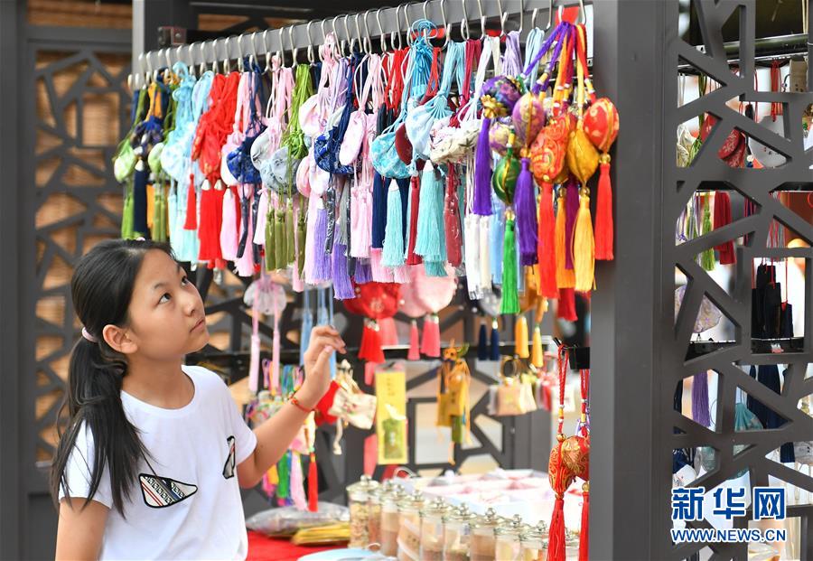 6月25日,在陕西西安大唐不夜城步行街,小朋友挑选香囊。新华社记者 张博文 摄