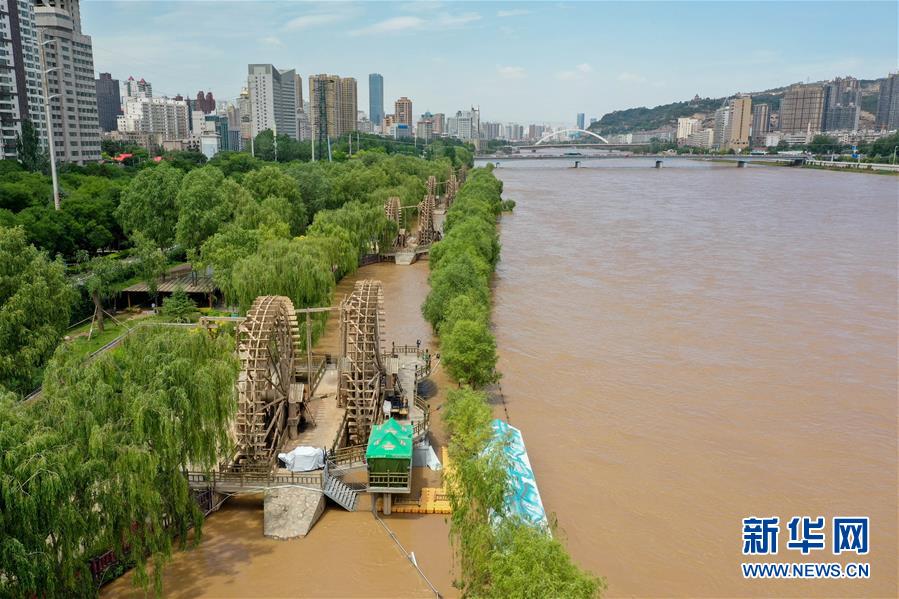 这是6月27日拍摄的黄河兰州段水车博览园(无人机照片)。 受近期持续降水和上游龙羊峡水库、刘家峡水库调蓄影响,黄河兰州段水位上涨。兰州市已将沿河的公园、索道码头等部分设施以及羊皮筏子漂流、快艇等旅游项目暂时关闭。 新华社发(郎兵兵摄)