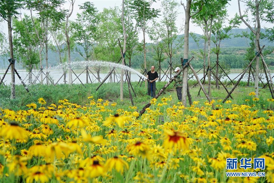 6月27日,园林工人在迁西县长河带状公园给绿地浇水。新华社记者 牟宇 摄
