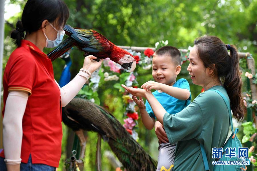 6月27日,一名小朋友在家人的陪伴下在石家庄市动物园里游玩。 端午小长假期间,人们纷纷带着孩子走出家门共享假期。 新华社发(许建园 摄)